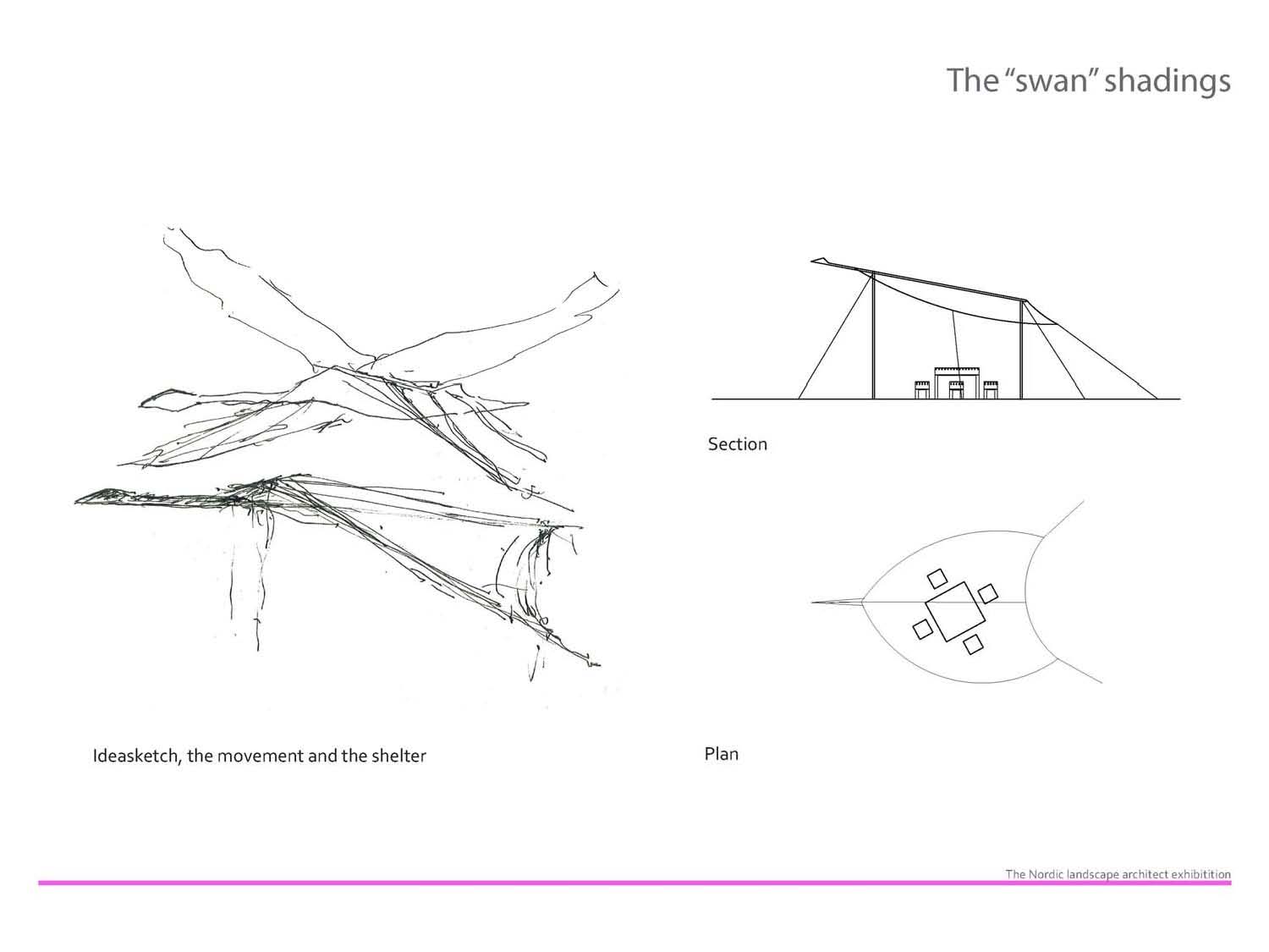 Sameiginlegt tákn Norrænu ráðherranefndarinnar er svanurinn, einnig græna norræna vottunarmerkið, sóltjöldin voru hönnuð með þetta í huga að undir verndarvæng svansins stæðu borðin og stólarnir með verkunum. Sýnendur gátu nýtt sér þrívíða möguleika á framsetningu í borðum og stólum, sýnt áferðir og prufur og hljóðið bætti svo fjórðu víddinni við og gáfu sérstaka stemmingu við hvert borð. Verkið sem valið var frá Íslandi var Hellisheiðavirkjun, en verkefnið var unnið á Landslagi.